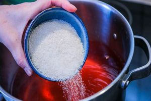 6. Добавить сахар и вернуть кастрюлю с сиропом на плиту. Дождаться, когда жидкость закипит, уменьшить огонь до минимального и проварить 5 минут.