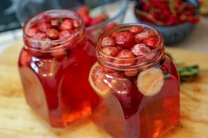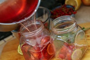 8. Сиропа должно быть много, он должен переливаться через край. Плотно закрыть банки с компотом ошпаренными металлическими крышками. Перевернуть банки кверху дном, прикрыть пледом и оставить на ночь медленно остывать. Готовый компот мохито из клубники с лаймом и мятой хранить в сухом прохладном месте.