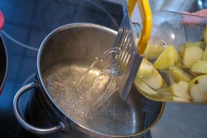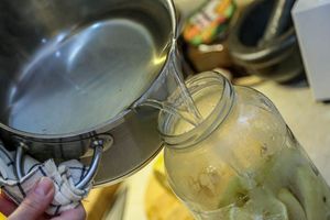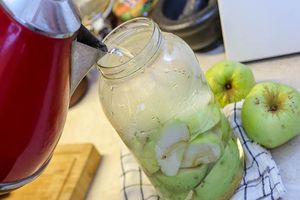 2. Банки вымыть, простерилизовать любым удобным для вас способом. Разложить яблоки по подготовленным банкам, заполняя на 1/3 или наполовину. Залить яблоки кипятком, прикрыть прокипяченными крышками и оставить настаиваться на 20 минут.