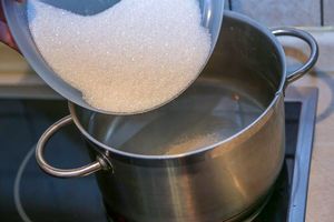 4. Добавить сахар из расчета 300г на 1 трехлитровую банку. Можно добавить больше сахара, если хотите получить очень сладкий яблочный компот, который надо будет разбавлять водой. Довести сироп до кипения и проварить 1-2 минуты на медленном огне.