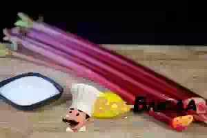 2. Ножом отрежьте верхнюю и нижнюю части стеблей ревеня, очистите стебли от верхнего слоя.
