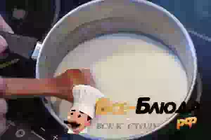 3. В молоко добавить сахар, влить ванильную эссенцию и доведите до кипения. Тонкой струйкой влить половину горячего молока в желтки, непрерывно размешивая, чтобы желтки не свернулись. Затем перелить желтки с молоком обратно в кастрюлю с оставшейся половиной молока.
