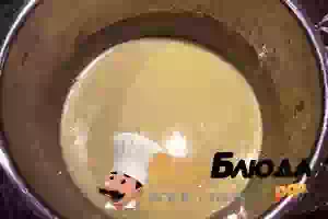 3. Выливаем немного молочной смеси в желтки, быстро размешиваем, потом выливаем смесь обратно в молоко, размешиваем, ставим обратно на медленный огонь и доводим почти до кипения, постоянно интенсивно помешивая, но не кипятим. Смесь слегка густеет.