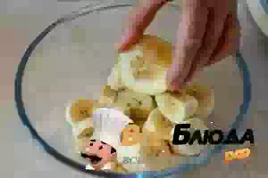 2. Бананы очистить, нарезать кусочками и сложить в миску. Чтобы банановая мякоть не темнела, сбрызнуть её свежевыжатым лимонным соком.