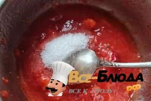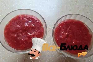 5. В это время перебрать клубнику и пюрировать блендером. Перелить клубничное пюре в ковшик, добавить сахар по вкусу и прогреть на слабом огне, размешивая, пока не растворится сахар. Если хотите получить однородное ягодное пюре, то протрите его через металлическое сито.