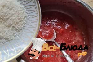 6. Как и в предыдущем случае, в горячую массу засыпать порошковый желатин и активно размешать. Дать клубничному желе остыть при комнатной температуре.