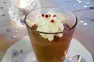 4. Дать шоколаду немного остыть и вмешать в него желтки, по одному. Взбить сливки и осторожно вмешать в них шоколад, поворачивая лопаткой снизу вверх, от краёв к середине. Чтобы не выбить пузырьки воздуха из сливок. Выложить в формочки и поставить на холод. Перед самой подачей добавить взбитые сливки и посыпать зёрнами розового перца.
