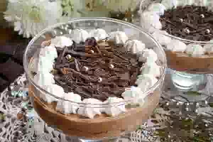 5. Разложить массу по креманкам. Украсить на свое усмотрение. Можно положить взбитые сливки в кулинарный шприц и отсадить небольшие цветочки, посыпать нарезанным шоколадом или какао-порошком. Поставить в холодильник минимум на 1 час, а лучше на всю ночь. За это время желатин застынет, и шоколадный мусс без яиц приобретет нужную текстуру.