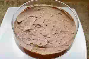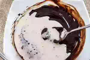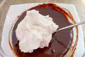 3. Сливки взбить отдельно до устойчивых пиков, подсыпая сахарную пудру. Добавить треть в остывшую шоколадно-желатиновую массу. Аккуратно смешать.