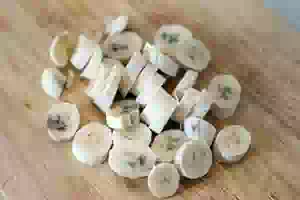 1. Бананы очистить, взвесить нужное количество и нарезать кружочками толщиной около 2 см.