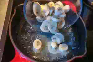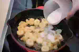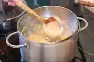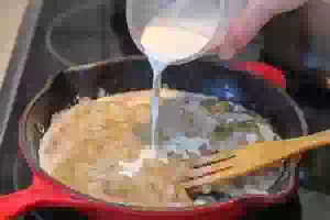 5. После этого в сковороду можно вливать теплые сливки. Делать это надо тонкой струйкой, размешивая содержимое сковороды лопаткой. Снять сковороду с плиты, дать немного остыть и переложить в миску.