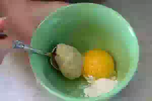 7. В отдельно посуде размешать сырой яичный желток с несколькими ложками банановой смеси и крахмалом. Размешать надо хорошо, чтобы не осталось комочков.