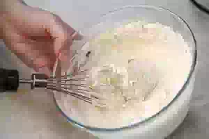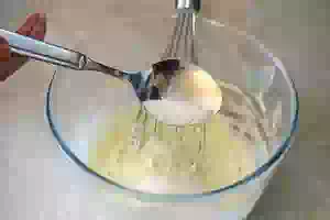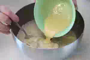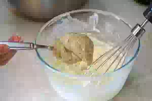 11. Когда заварной банановый крем достигнет той же температуры, что и сливочное масло, по ложке добавлять к маслу и взбивать миксером.