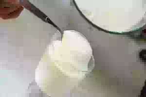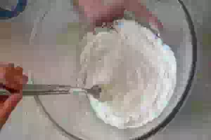 4. Продолжить взбивать крем, подливая охлажденные жирные сливки и сахарную пудру. Попробуйте крем, и если вам покажется, что он недостаточно сладкий, то можете добавить больше сахарной пудры, чем написано в ингредиентах. Взбивать крем сначала на маленькой скорости, затем перейти на высокую. Как только почувствуете, что крем стал более плотный, воздушный, выключить миксер.