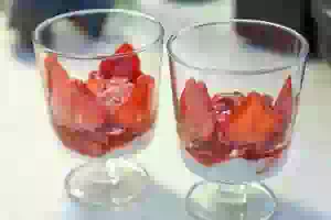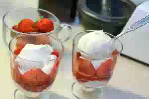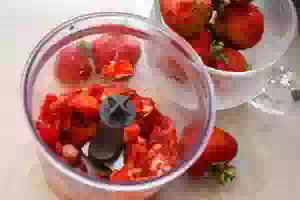 1. Клубнику перебрать, промыть, обсушить на бумажных полотенцах и отделить плодоножки. Сложить в чашу блендера и слегка пробить на пульсирующем режиме, чтобы ягоды дали сок. Если клубника не достаточно сладкая, посыпать её сахарной пудрой. По желанию эту смесь сбрызнуть ромом (или коньяком).
