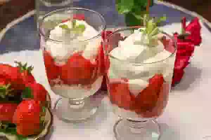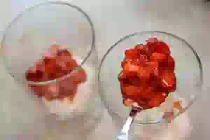 7. Если хотите украсить креманки, то возьмите крупные ягоды, нарежьте её пластинами и установите их по краям десерта, чтобы клубничные дольки красиво просматривались через стекло.
