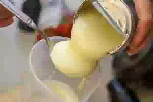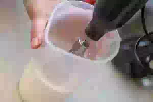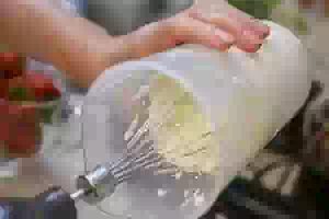 2. Охлажденные жирные сливки начать взбивать на небольшой скорости, постепенно увеличивая её, пока сливки не начнут из жидких становится устойчивыми.