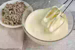 5. Измельченную халву добавьте в пенную желтковую массу, аккуратно перемешайте. Добавьте взбитые сливки, перемешайте.