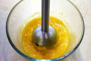 1. Спелое сочное манго разрезать пополам, вырезать косточку, мякоть очистить от кожуры. Сделать это можно по-разному, здесь показываю один из вариантов, как очистить манго. Пробить кусочки манго погружным блендером, затем протереть через металлическое сито, чтобы избавиться от волокон, которые попадаются в мякоти даже самого спелого манго.