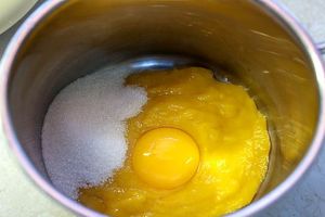 2. Перелить получившееся манговое пюре в небольшой ковш с толстым дном. Добавить к манго яичные желтки, щепотку соли и сахар. Выдавить сок лимона или лайма (я еще добавила немного цедры лайма) и пробить всё венчиком до однородности.