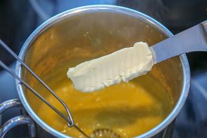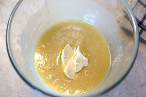 3. Поставить ковш с фруктовым кремом на маленький огонь и варить при постоянном помешивании примерно 15 минут, пока смесь не загустеет и начнет пузыриться. После этого снять ковш с готовым курдом из манго с огня и добавить сливочное масло. Перемешать венчиком, оставить при комнатной температуре. Когда крем остынет, прикрыть крем пищевой пленкой в контакт и убрать в холодильник.