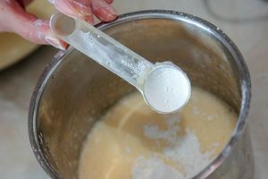 2. Следом добавить щепотку соли и кукурузный крахмал. Хорошо размешать венчиком. Вместо крахмала можно взять муку.
