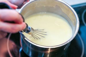 и поставить на плиту. Размешивая, чтобы крем не пригорал, варить на слабом огне до появления первых бульков.