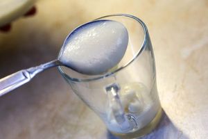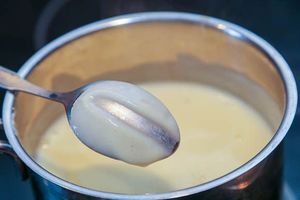 К этому моменту заварной крем заметно загустеет. Для проверки готовности крема проведите пальцем по ложке, которой размешивали крем. Если на на ней останется четкий след, который держится и не затекает, то крем готов. Если при варке крема в нем образовались комочки, то протрите его через металлическое сито.