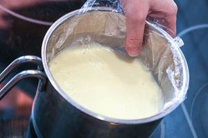 6. Затянуть посуду пищевой пленкой, чтобы пленка вплотную прилегала к слою заварного крема. Дать крему остыть сначала при комнатной температуре, а затем можно поставить в холодильник.