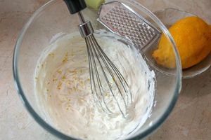 7. Пока остывает заварная основа для крема, сыр маскарпоне взбить венчиком. По желанию добавьте цедру лимона и сахарную пудру. Когда маскарпоне и заварной крем станут одной температуры, добавлять в миску с макарпоне по 2 ст.л. заварной основы, каждый раз взбивая миксером.