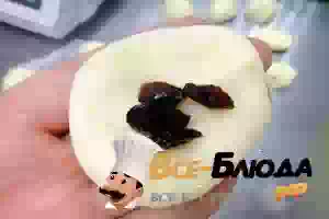 3. Затем отщипывайте от сладкой массы шарики с размером с грецкий орех. Расплющьте немного в лепёшку и положите в середину начинку.