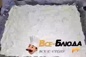 2. Тесто получится чуть гуще жирной сметаны. Его совершенно невозможно раскатать или вылить на противень. Поэтому застелем прямоугольную форму размером 22х32 см пекарской промасленной бумагой и лопаткой распределим по ней тесто. Фактически размажем его по поверхности и отставим в сторону.