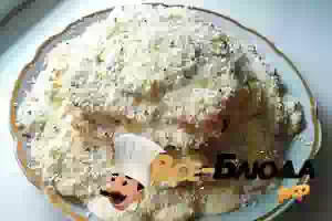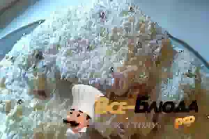 4. Чтобы сделать крем, нужно заранее достать масло из холодильника: оно должно подтаять. Подтаявшее масло взбить с сахаром и сметаной. Крема должно получиться много. За счет большого количества крема торт получается невероятно нежным. Когда коржики приготовятся, их нужно полностью обмакнуть в крем и разложить на блюдо слоями. Сверху присыпать стружкой кокоса с бусинами. Приготовленный торт поставить в холодильник на 7 часов.