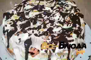 6. Достать форму из холодильника, раскрыть края пленки, накрыть плоской тарелкой и перевернуть её вместе с формой. Убрать с торта пленку. Для украшения торта растопить на водяной бане шоколад с маслом и залить верх торта «Дамские пальчики». Подержать готовый торт в холодильнике до полного застывания шоколада. Заварной торт готов.