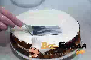4. По частям очень аккуратно, двигая венчик снизу вверх, примешать измельченный миндаль. На дно формы с разъемными боками уложить лист бумаги для выпечки. Дно и бока формы смазать сливочным маслом и припудрить мукой. Вылить тесто и поставить на среднюю полку в предварительно разогретую до 180С духовку. Выпекать около 30 минут. Если верх начнет подгорать - накройте листом фольги. Готовый пирог оставьте остывать в форме. Когда пирог остынет, переложить на тарелку и разрезать вдоль на 2 равных коржа.