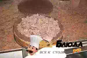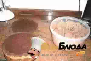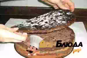 2. Готовый бисквит достать из духовки, дать остыть, после чего срезать крышку (ножом или ниткой), надрезать края, чтобы остались стенки толщиной около 2 см и ложкой вынуть мякиш. Мякиш измельчить, но не в крошки, а в небольшие кусочки. Высыпать их в крем, приготовленный из взбитого сливочного масла со сгущенкой и какао. Туда же добавить вишню без жидкости и, если хочется, молотые грецкие орехи по вкусу. Все перемешать. Вишню можно использовать из варенья или компота или вяленую. Ягоды предварительно (за 10 дней) надо замочить в коньяке или в водке.