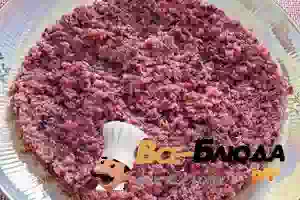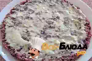 5. Смазываем корж сметанным кремом, на крем укладываем измельчённые крошки, которые тоже перемешиваем с кремом.