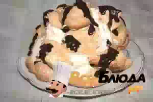 3. Взбить сливки, добавить сахар по вкусу. По кругу выложить на блюдо первый слой безе, в промежутки между безе проложить крем. Далее, намазывать донышки безе кремом и укладывать следующие слои. В результате должен получится конусообразный торт. Пространства между безе советуем заполнить кремом. Растопить шоколад и полить его поверх безе. Готовый торт убрать в холодильник на1-2 часа, после чего можно быстро съесть.