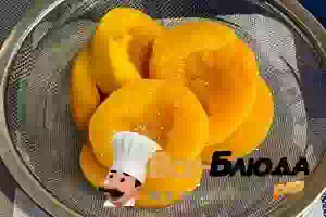 2. Персики выкладываем на дуршлаг, даём стечь сиропу и измельчаем персики в пюре. В половине стакана сиропа из-под персиков замачиваем желатин. Набухший желатин соединяем с пюре и нагреваем, помешивая, на небольшом огне до его полного растворения. Отставляем в сторону, чтобы пюре остыло.
