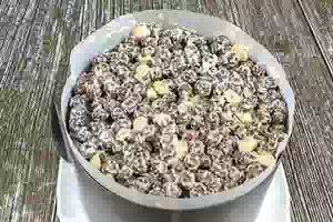 1. Для начала займемся кремом. Сливочное масло заранее достать из холодильника. Размягченное сливочное масло взбиваем слегка блендером. Затем по несколько столовых ложек добавляем сгущенку, продолжая взбивать масло на низкой скорости. Если сгущенка окажется жидкой, то уйдет меньшее количество. Если густой, то может понадобиться и целая баночка. В итоге получится масляный крем со сгущенкой, который будет хорошо держать форму. Добавляем в крем обжаренный арахис и перемешиваем. Основой десерта будут шоколадные шарики. Берем 250г сухого завтрака и добавляем крем. Далее пересыпаем в миску побольше и вымешиваем рукой. Формировать торт будем в разъемную форму. Стенки круглой формы оборачиваем бумагой для выпечки, заранее смазывая растительным маслом.