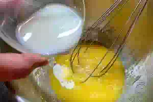 1. В глубокой миске взбить яйца с сахаром. Взбивать можно как миксером, так и просто венчиком, это не принципиально. Добавить молоко, еще раз взбить.