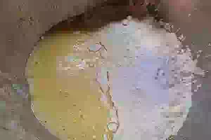 3. Муку смешать с солью, ванилином и содой, и, постепенно размешивая тесто венчиком, смешать с жидкой частью теста.