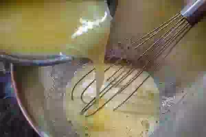 2. Сливочное масло растопить, дать ему немного остыть и перелить в яичную смесь.