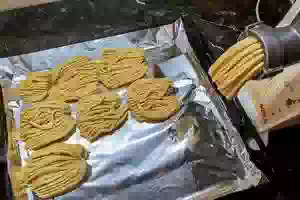 5. Противень застелить пекарской бумагой или фольгой. Включить духовку на 180С. С помочью мясорубки прокрутить тесто и выложить его частями на противень, как показано на фото. Выпекать при температуре 180 градусов примерно 15-20 минут.