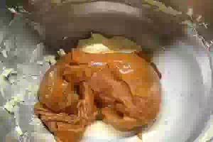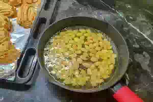 7. Теперь пришла очередь орехов. Для подготовки миндаля положить его в кипящую воду, отваривать 3-4 минуты, после чего горячую воду слить и залить холодной. После этого миндаль легко чистится от коричневой пленки (кожуры). В маленькой сковороде или сотейнике разогреть растительное масло и обжарить отваренный миндаль до золотистого цвета.
