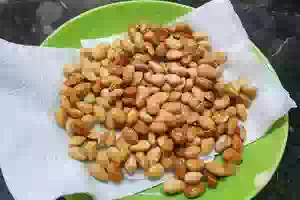 8. Обжаренный миндаль переложить на бумажное полотенце, дождаться, когда он остынет, и затем измельчить в комбайне или вручную - порубить ножом.