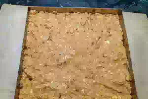 12. Подготовить форму. Удобнее готовить десерт в квадратной форме без дна. Вы можете использовать любую другую посуду, из которой Вам будет удобнее доставать приготовленный десерт. Дно (в этом случае слой пекарской бумаги) присыпать небольшим количеством крошки. Затем выложить всю массу и разровнять. Сверху присыпать крошкой и отправить в холодильник для стабилизации на 3-4 часа.