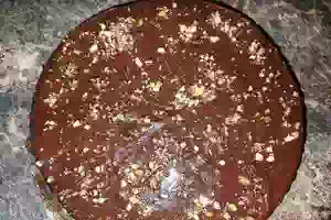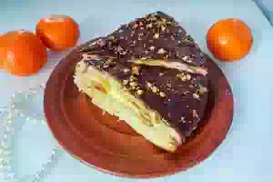 9. Украсить торт измельченными грецкими орехами. Отправим бисквит на пропитку в холодильник на несколько часов. Домашний бисквитный торт с заварным масляным кремом и шоколадной глазури готов к подаче на стол.
