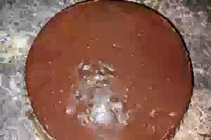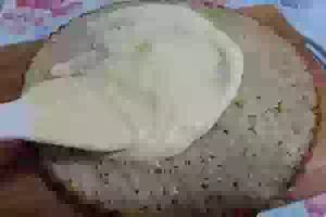 7. Бисквитный торт с заварным кремом и домашней глазурью, Шаг 07 Заварным масляным кремом смазать нижний корж. Накрыть вторым коржом и полить всё глазурью.