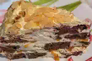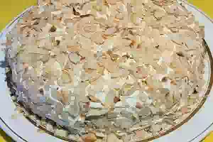 8. Обсыпаем весь торт миндальными лепестками. Дадим постоять торту в холодильнике несколько часов, а затем удивим чудесным вкусом дорогих гостей. Мраморный торт с кремом из маскарпоне и йогурта готов.